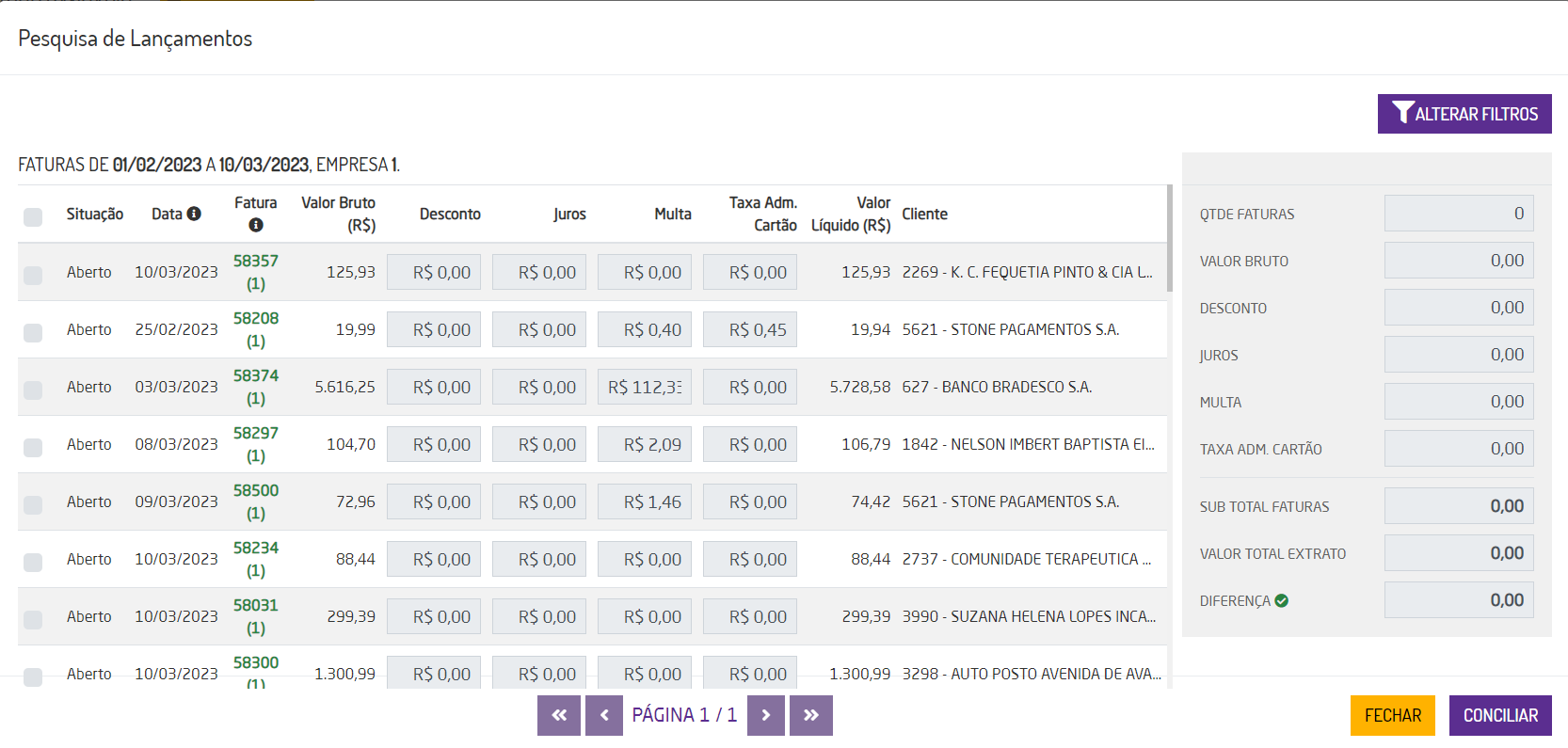 1. Faturas em aberto: valor do extrato deve estar entre valor da fatura com uma diferença de + ou - R$ 0,10 centavos e a data do extrato deve estar entre a data de vencimento, com uma diferença de + ou - 10 dias;