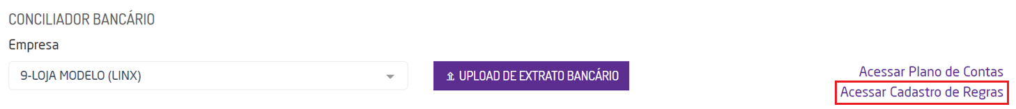 O acesso ao cadastro de regras pode ser feito através da tela do conciliador bancário, conforme a imagem abaixo: