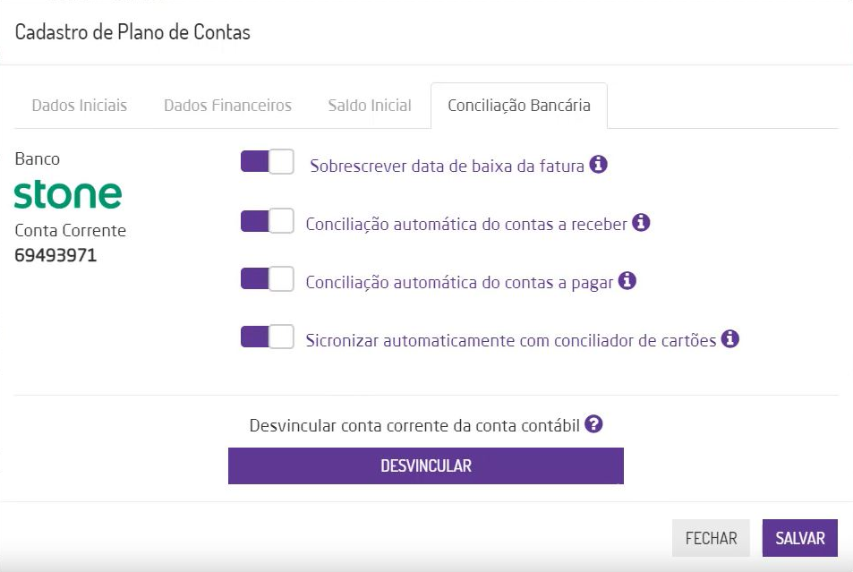 • Desvincular conta corrente da conta contábil: Ao desvincular uma conta corrente da conta contábil, as importações de extrato bancário não serão mais vinculadas a esta conta contábil, sendo necessário realizar um novo vínculo.