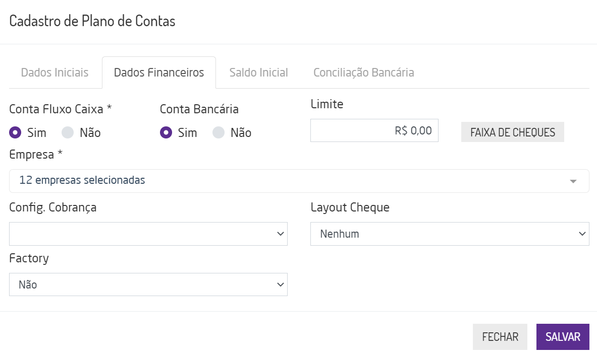 Na aba de Dados Financeiros selecionar "SIM" para conta fluxo de caixa e "SIM" para conta bancária.
