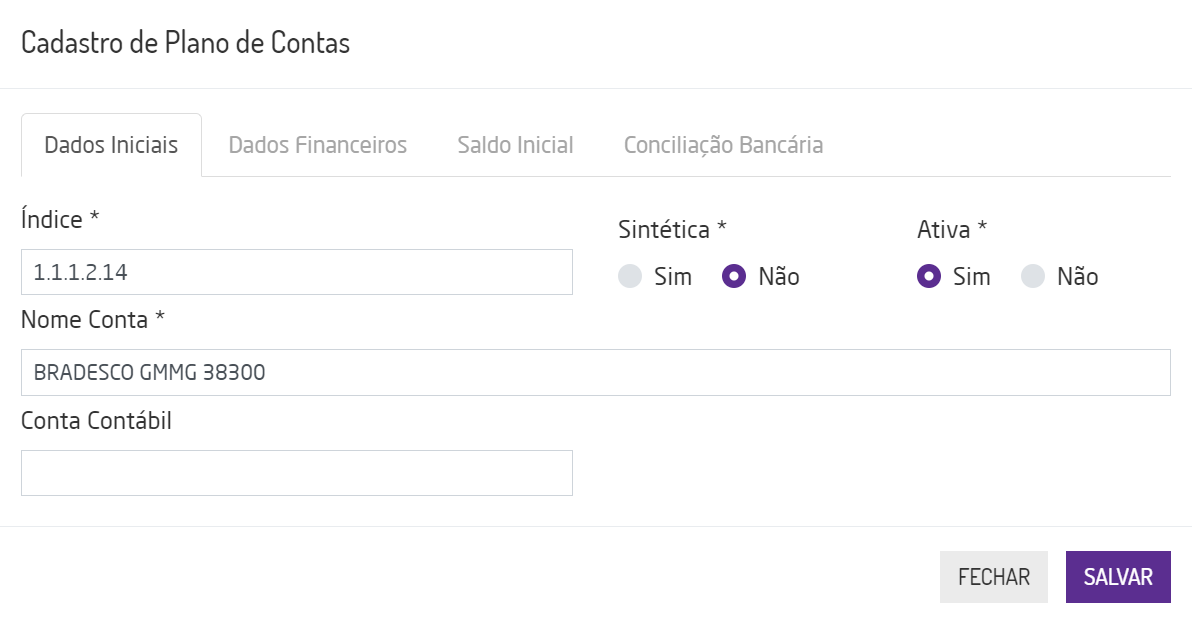 A conta bancária deverá ter a mesma identificação do extrato bancário que for importado no conciliador, a fim de facilitar a identificação.