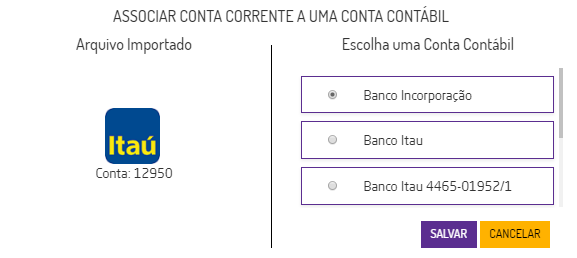 Para realizar o upload do extrato bancário é necessário selecionar o arquivo que deve estar salvo no computador. O sistema apresentará a logo do banco e as contas contábeis que não estão vinculadas a conta corrente do banco, sendo necessário selecionar a conta contábil desejada e clicar em "Salvar".