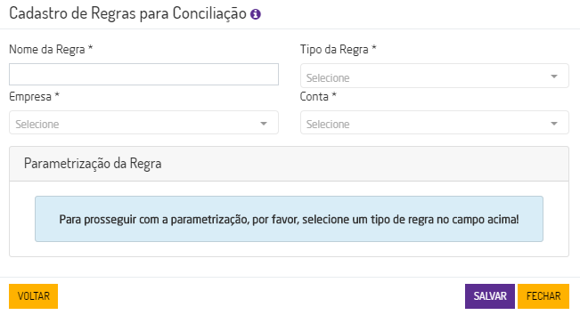 (informação) O cadastro de regras será acessado somente através do conciliador bancário e nele será apresentada a listagem de regras. Ao acessá-lo pela primeira vez, como não haverá nenhuma, o usuário será convidado a cadastrar.