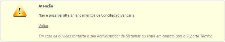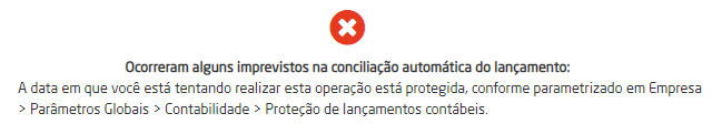Caso o extrato importado tenha lançamentos dentro do período de proteção contábil, mesmo que o Microvix possua uma fatura correspondente ao lançamento, não haverá conciliação e será apresentado um alerta na tela. Neste caso deverá ser gerada uma nova fatura ou realizar a alteração da data de proteção.
