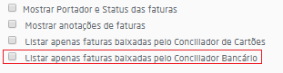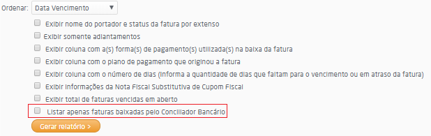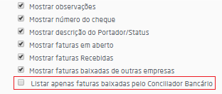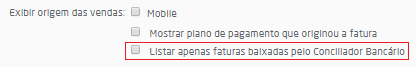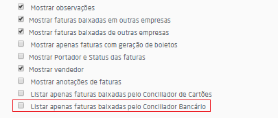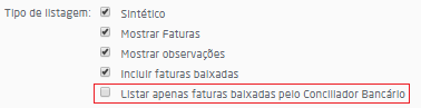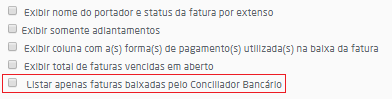 O relatório Faturas do Contas a Receber é exibido em Adm./Financeiro > Contas a Receber > Relatórios e nele será apresentado um filtro que condiciona o relatório a listar apenas faturas baixadas pelo conciliador bancário.