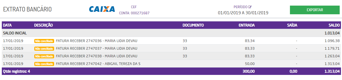 • Diferença: será apresentada a diferença entre o subtotal e o valor do extrato.