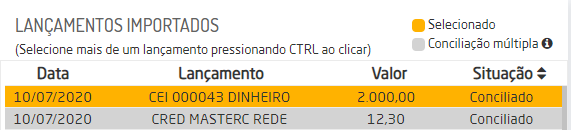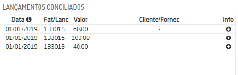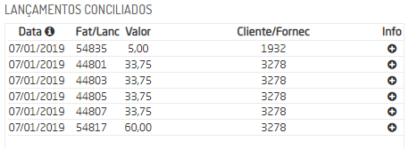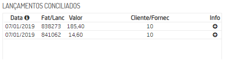 Quando não houver divergência de valores entre o extrato e o subtotal dos lançamentos a conciliação pode ser realizada e os dados dos lançamentos conciliadas poderão ser observados no quadro "Lançamentos Conciliados".