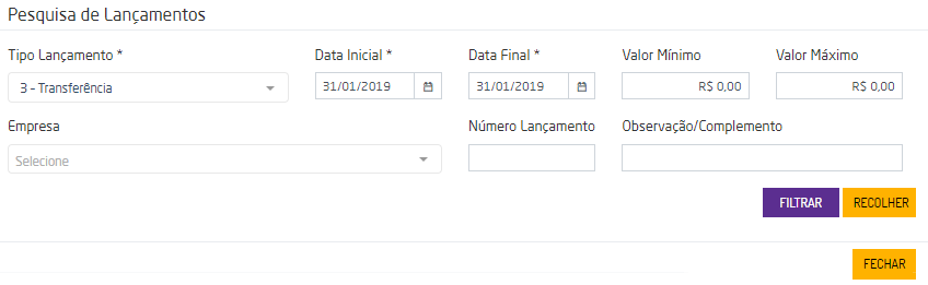 Para a busca de transferências são disponibilizados os seguintes campos: