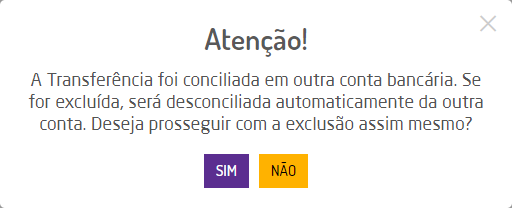 Conciliação Automática: Para conciliação automática deve existir apenas um lançamento do sistema idêntico ao lançamento do extrato, caso existam duas faturas/lançamentos a conciliação automática não será realizada (serão exibidas como sugestão).  Caso a fatura esteja em aberto e a conciliação automática aconteça, será efetuada a baixa automática da fatura. Além disso, para conciliação automática não deve existir dois lançamentos (fatura e transferência) com o mesmo valor.