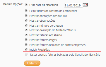 O relatório Faturas do Contas a Pagar é exibido em Adm./Financeiro > Contas a Pagar > Relatórios e nele é apresentado um filtro que condiciona o relatório a listar apenas faturas baixadas pelo conciliador bancário.