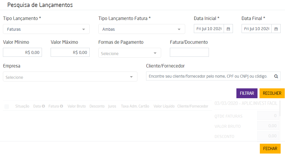 • Quantidade de Lançamentos: quantidade de faturas selecionadas;