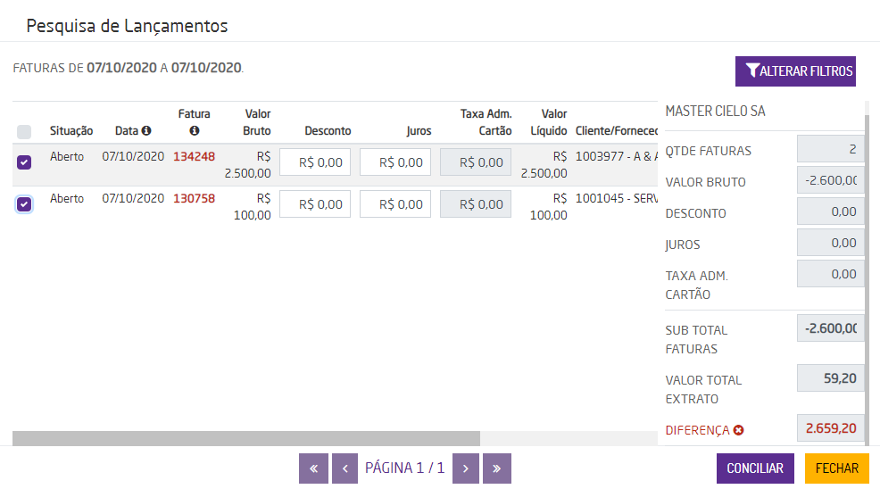Quando não houver divergência de valores entre o extrato e o subtotal das fatura a conciliação poderá ser realizada e os dados das faturas conciliadas poderão ser observados no quadro "Lançamentos Conciliados".