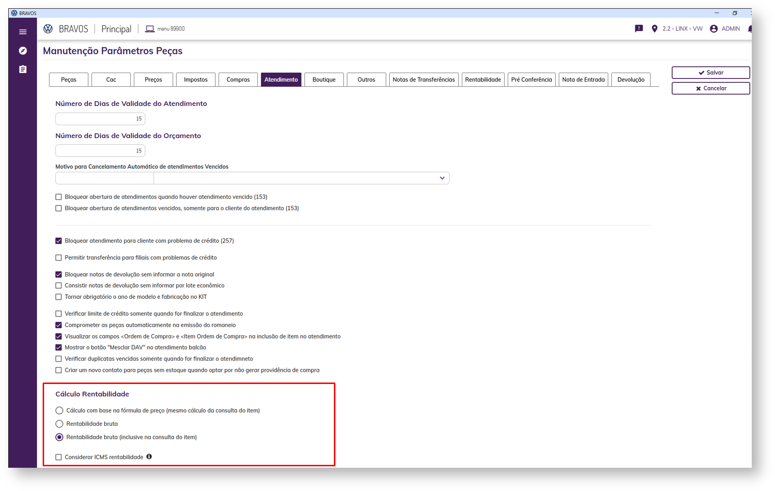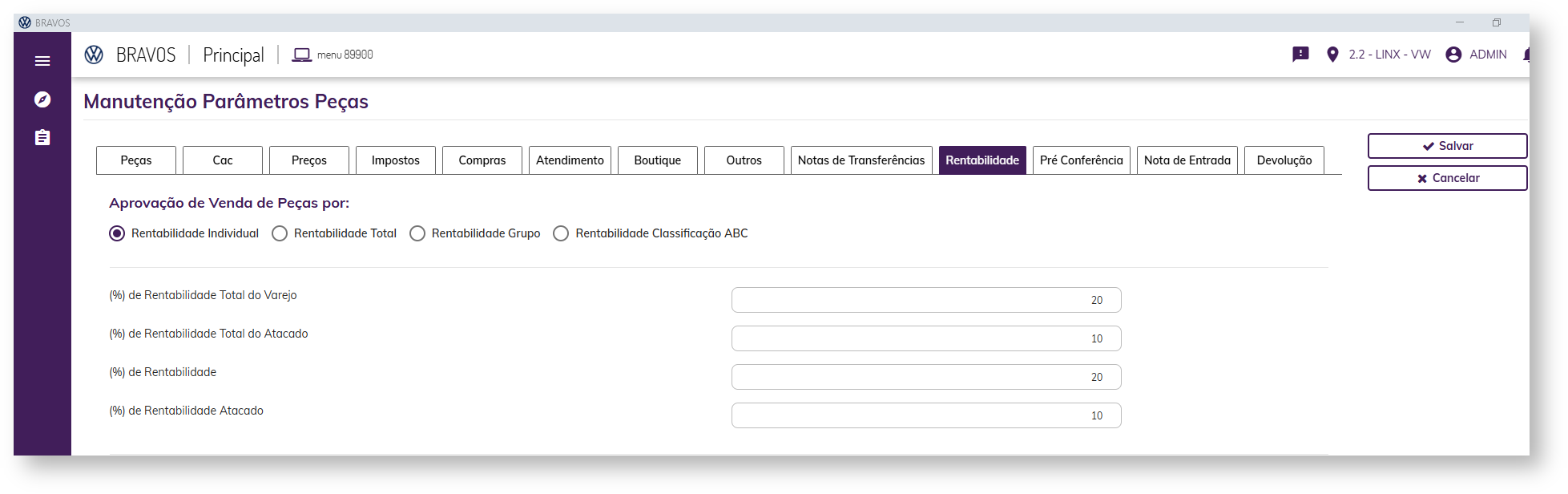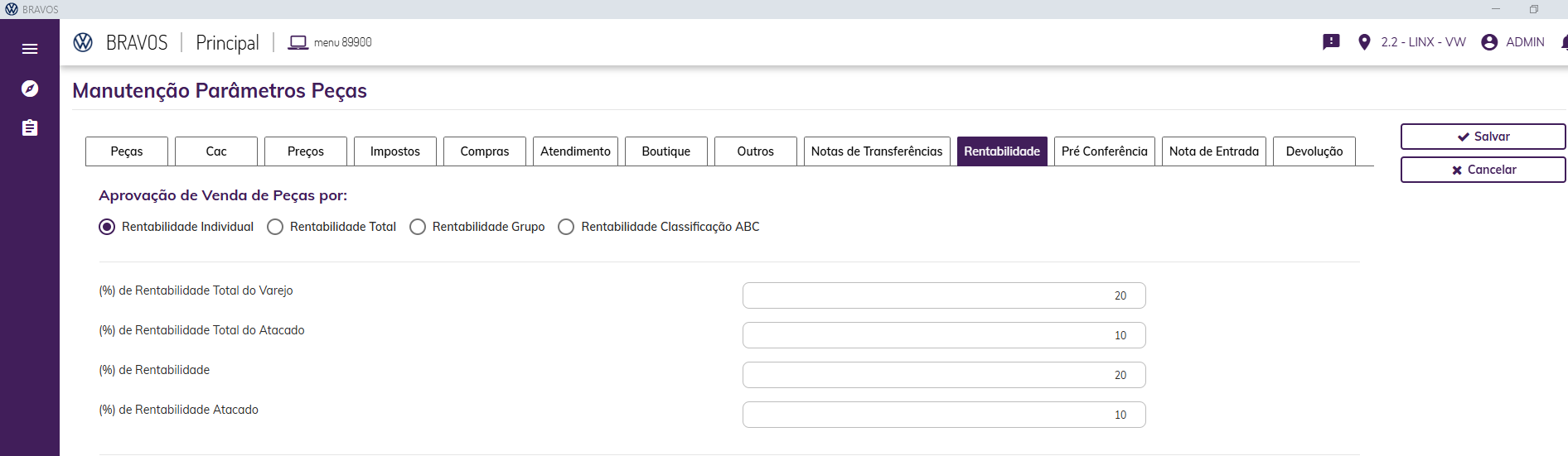 Para esta opção, deve entrar no menu “Peças > Parâmetros > Aba Rentabilidade”