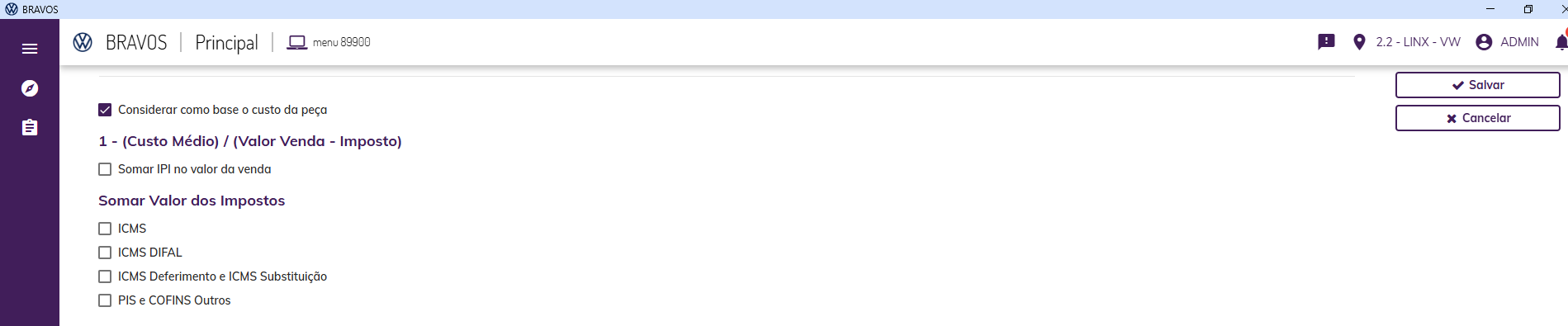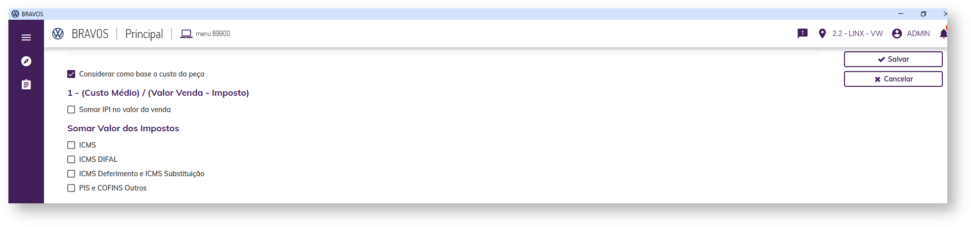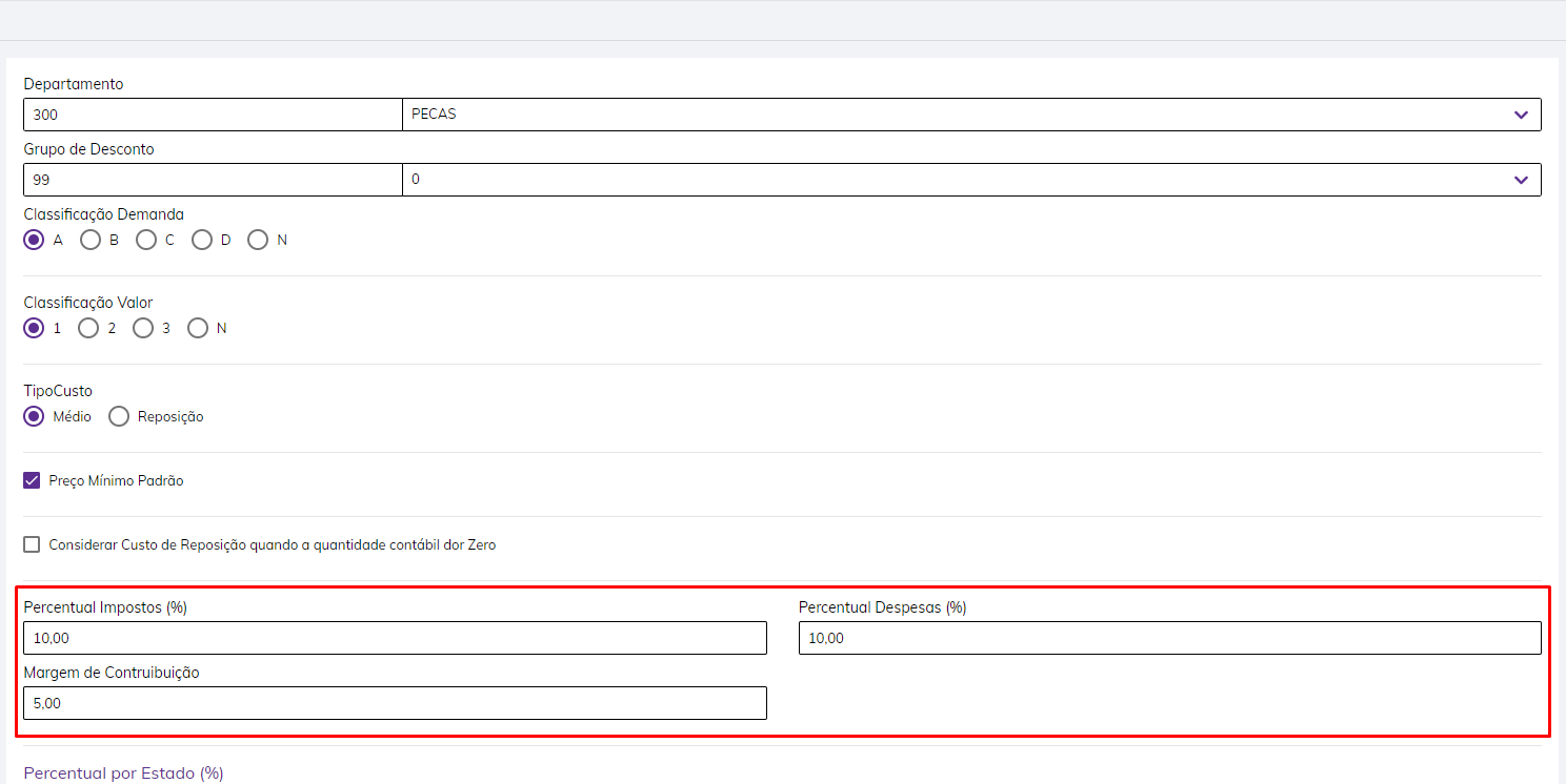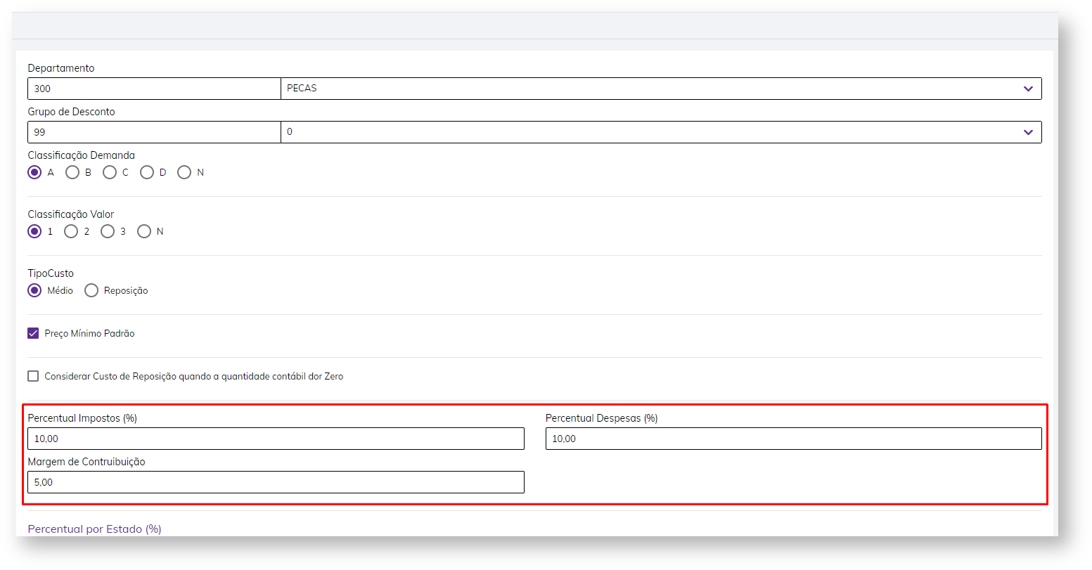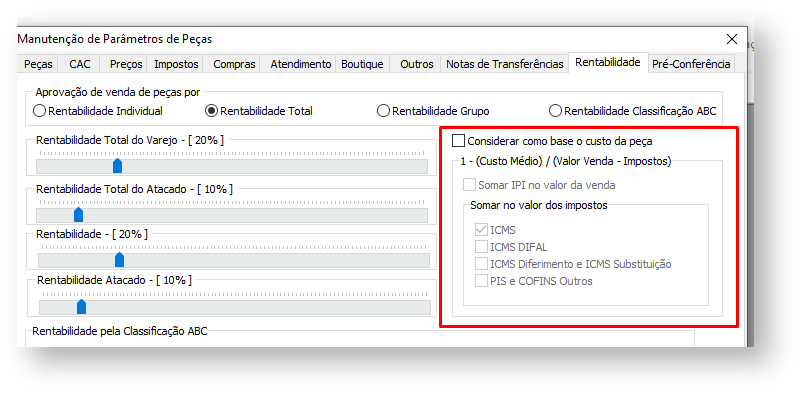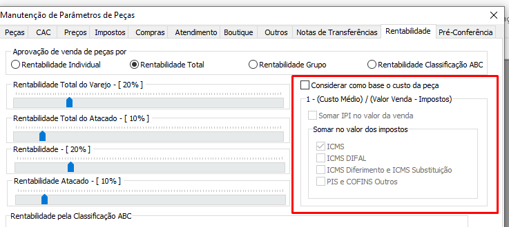 Caso desejemos parametrizar a rentabilidade com base no custo da peça, temos as seguintes opções adicionais, conforme a fórmula: (Custo Médio) / ( Valor Venda - Imposto):