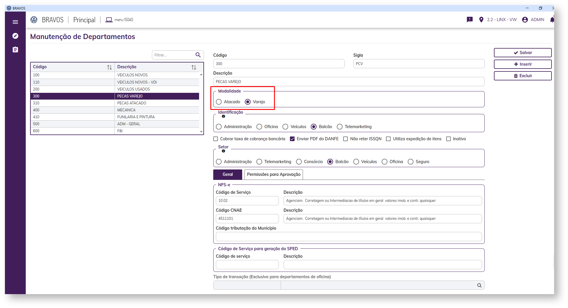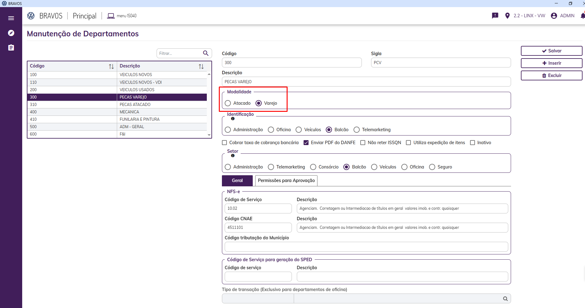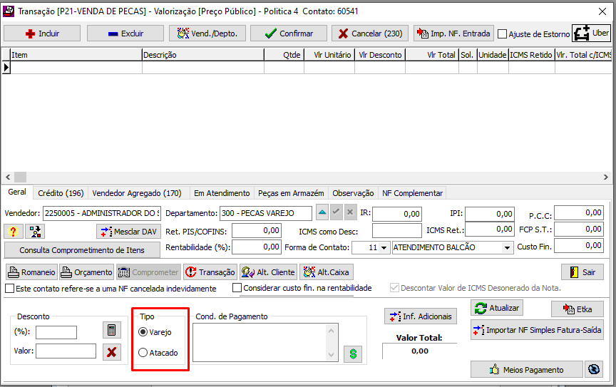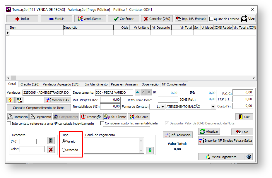A definição de Varejo ou Atacado é realizada conforme o departamento da venda. O cadastro do departamento pode ser consultado/alterado em “Configurações > Cadastros > Departamentos”.