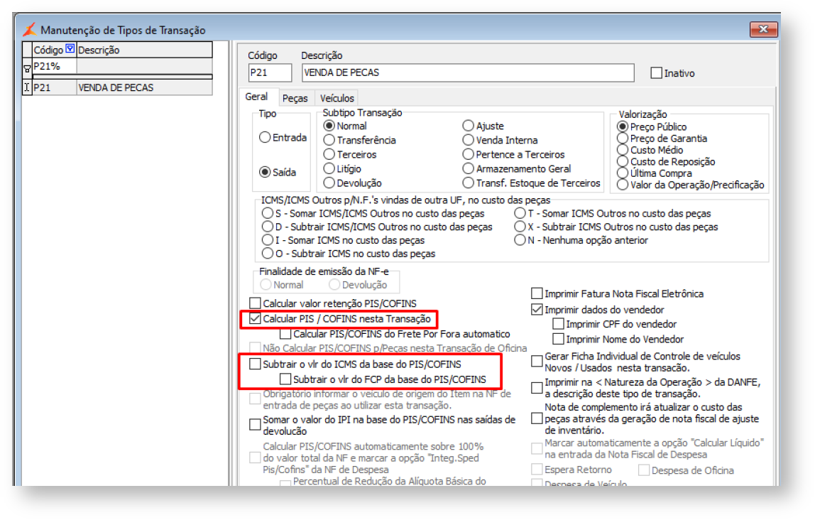 Entrando no menu: “Faturamento > Cadastros > Tipos de Transação”, marcando as opções conforme imagem abaixo, de acordo com sua necessidade fiscal: