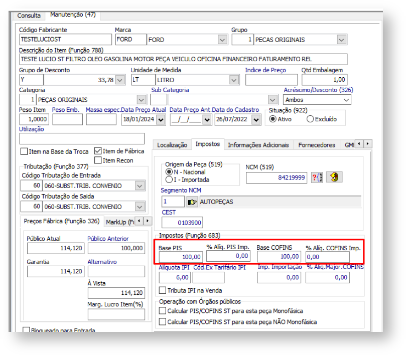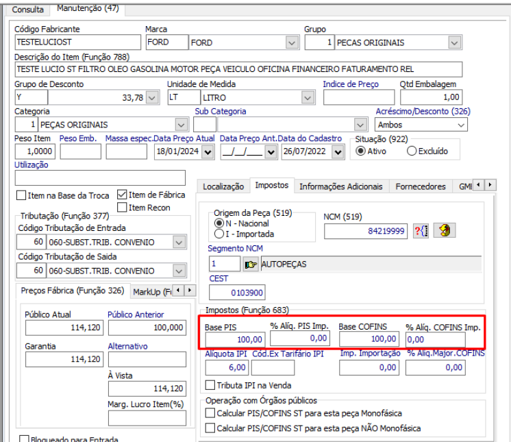 Ainda é necessário estar configurado no cadastro do item, no menu: “Peças > Cadastros > Itens > Aba Impostos”. Conforme imagem abaixo: