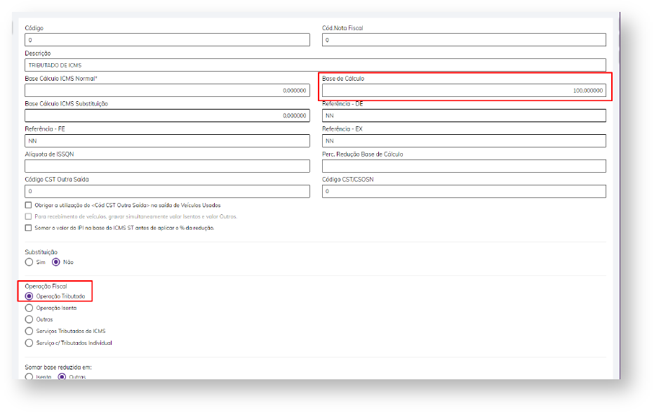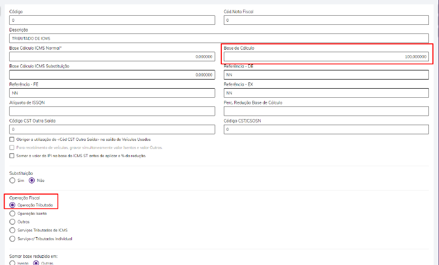 Observação: O campo “Operação Fiscal” deve estar com a opção “Operação Tributada” marcada.