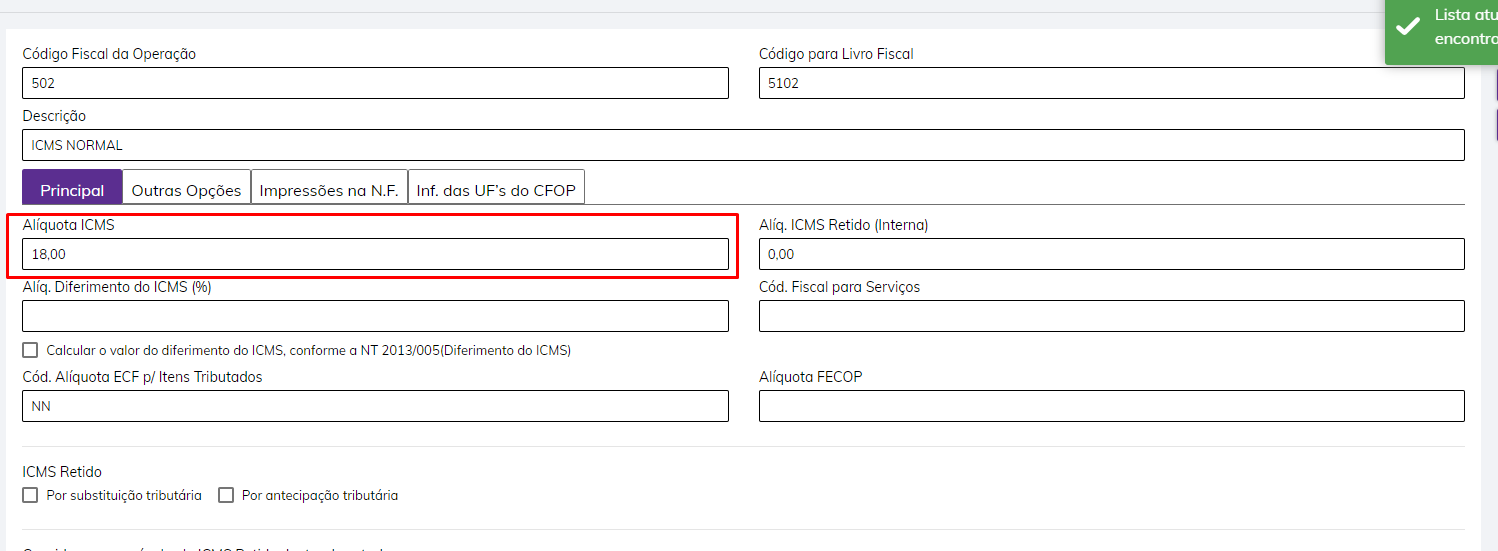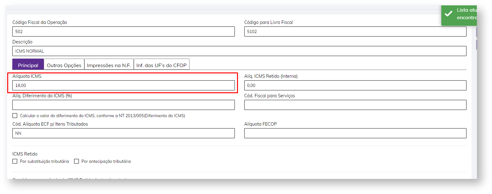 No menu “Configurações > Cadastros > Código Fiscal”, é definida a alíquota de imposto conforme imagem abaixo:
