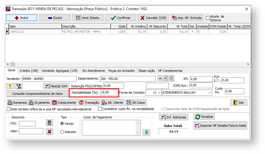3 - Rentabilidade Grupo: O sistema solicitará autorização para venda conforme soma da rentabilidade pelo grupo de peças.