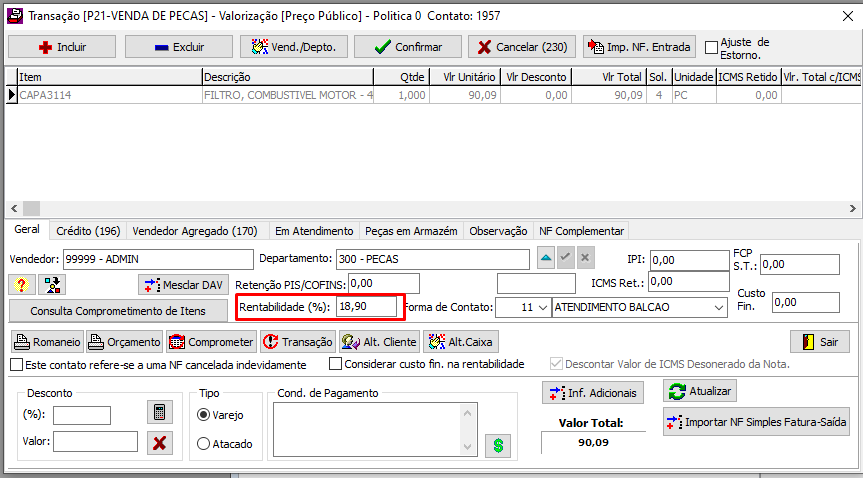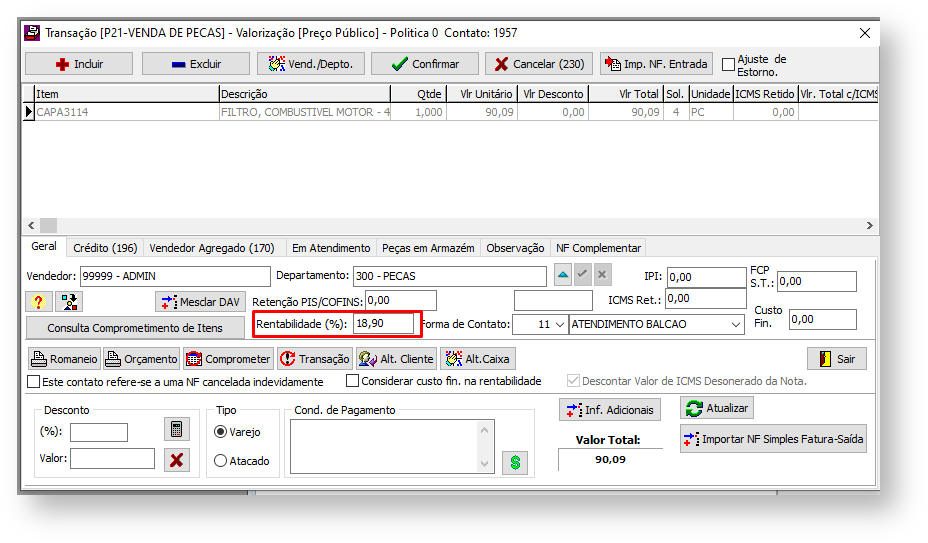 Rentabilidade Bruta (Inclusive na Consulta do Item): Calcula os impostos(ICMS) no atendimento balcão e na consulta do item(Simulação).