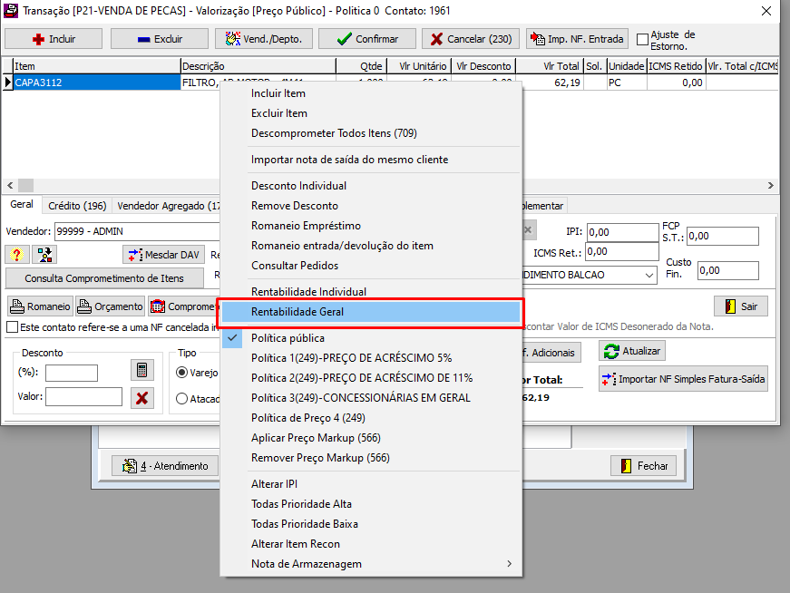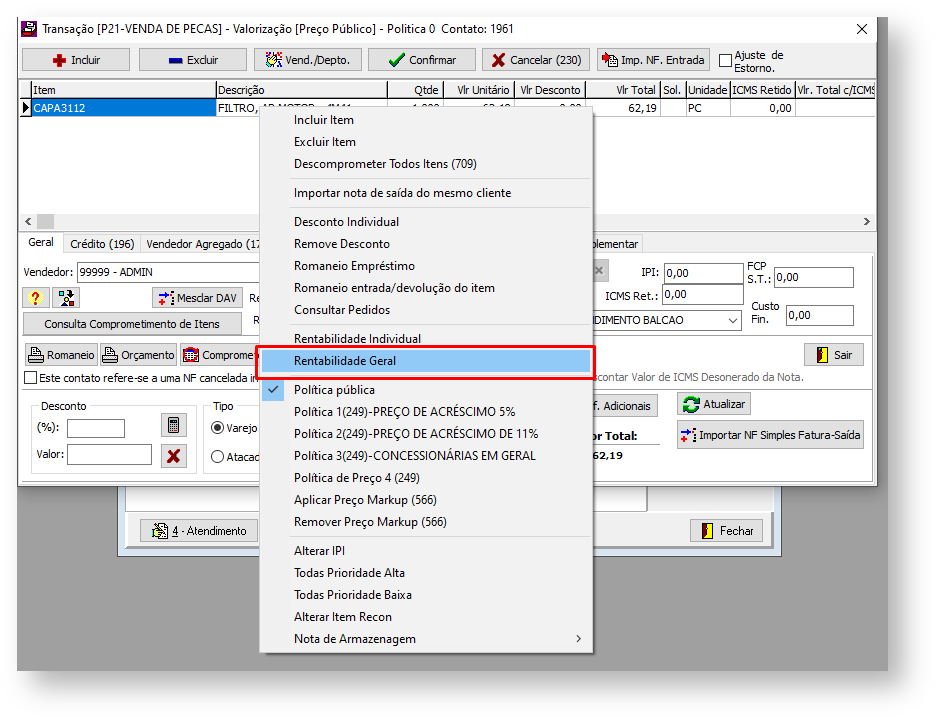No atendimento balcão pode se clicar com o lado direito em cima do item e em “Rentabilidade Geral” para verificar o custo médio do item sem necessidade de ver na consulta gerencial, conforme imagem abaixo: