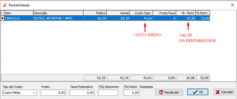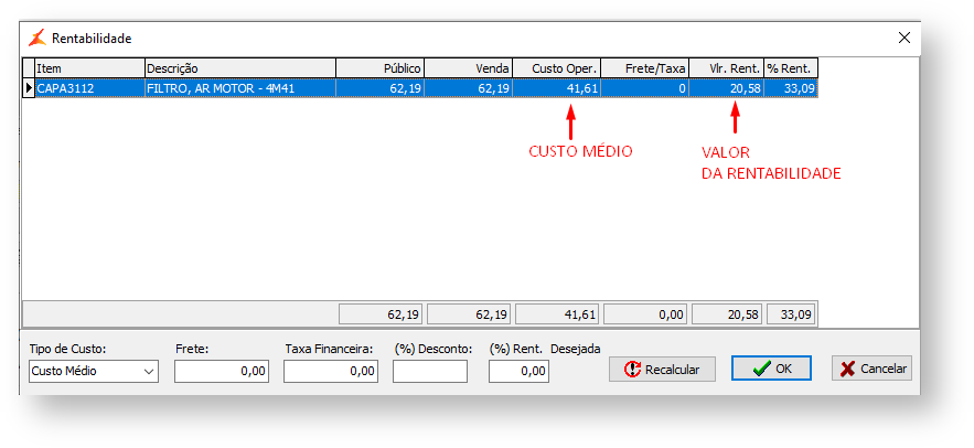 Custo Médio: Sempre será o custo médio do item e pode ser verificado em "Peças > Consulta Itens do Estoque > Informações Gerenciais".