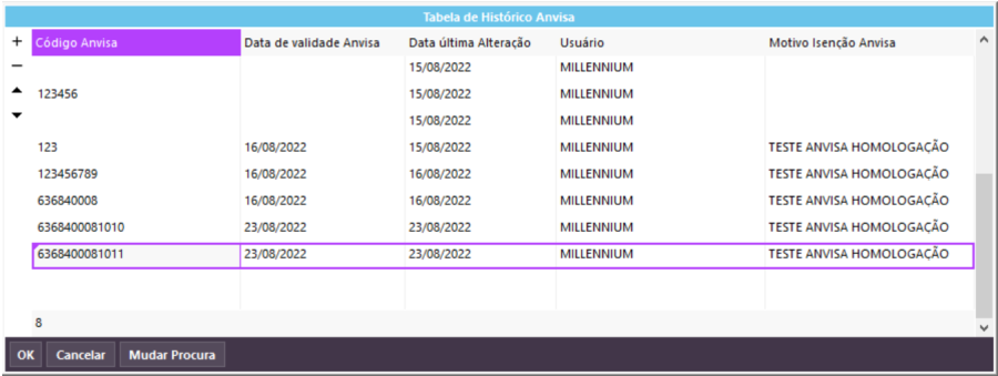 As alterações referentes aos dados da Anvisa, que forem realizadas no cadastro do produto, serão gravadas em uma tabela, para auxiliar no esclarecimento de eventuais dúvidas.