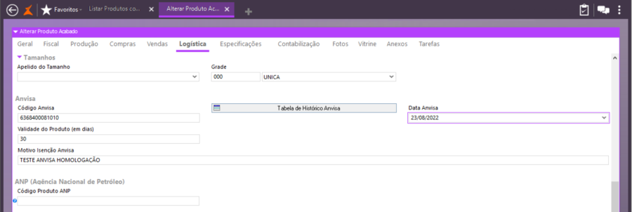 Em Produtos e Serviços\Produtos, na guia Logística, localize e preencha os campos referentes aos dados da Anvisa, sendo: