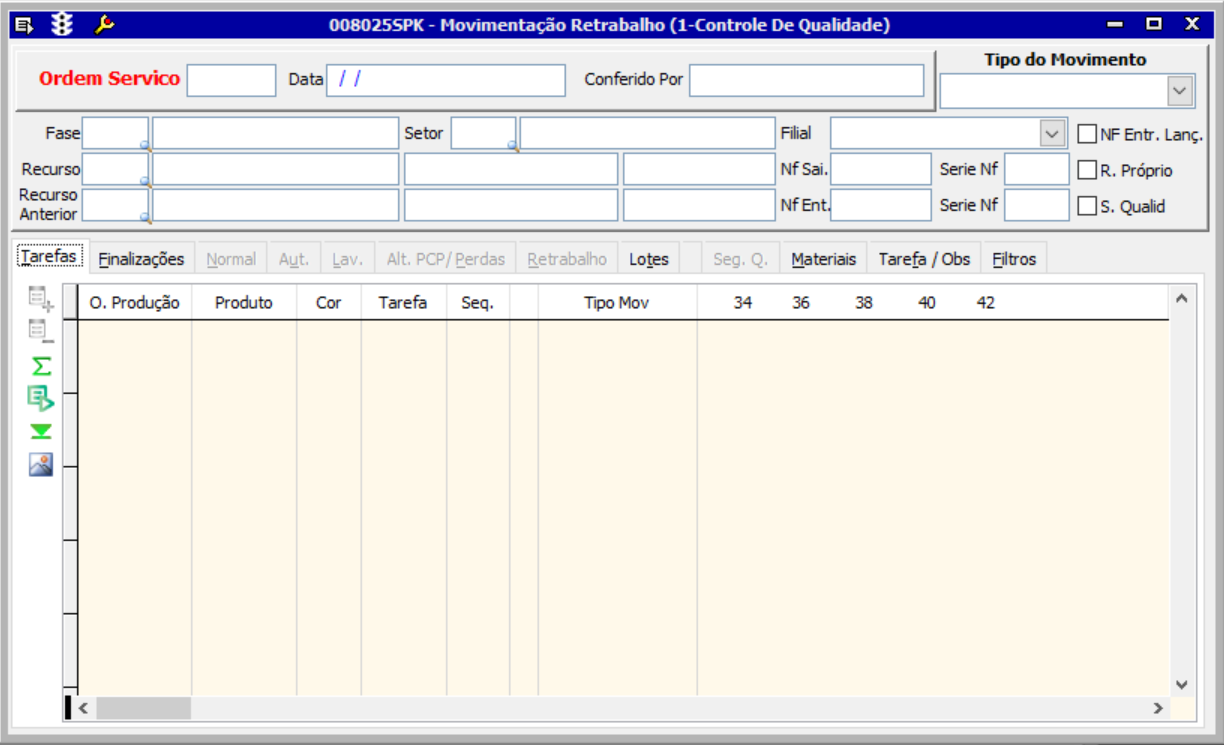 Antes de iniciar a movimentação de retrabalho é necessário selecionar o tipo do movimento