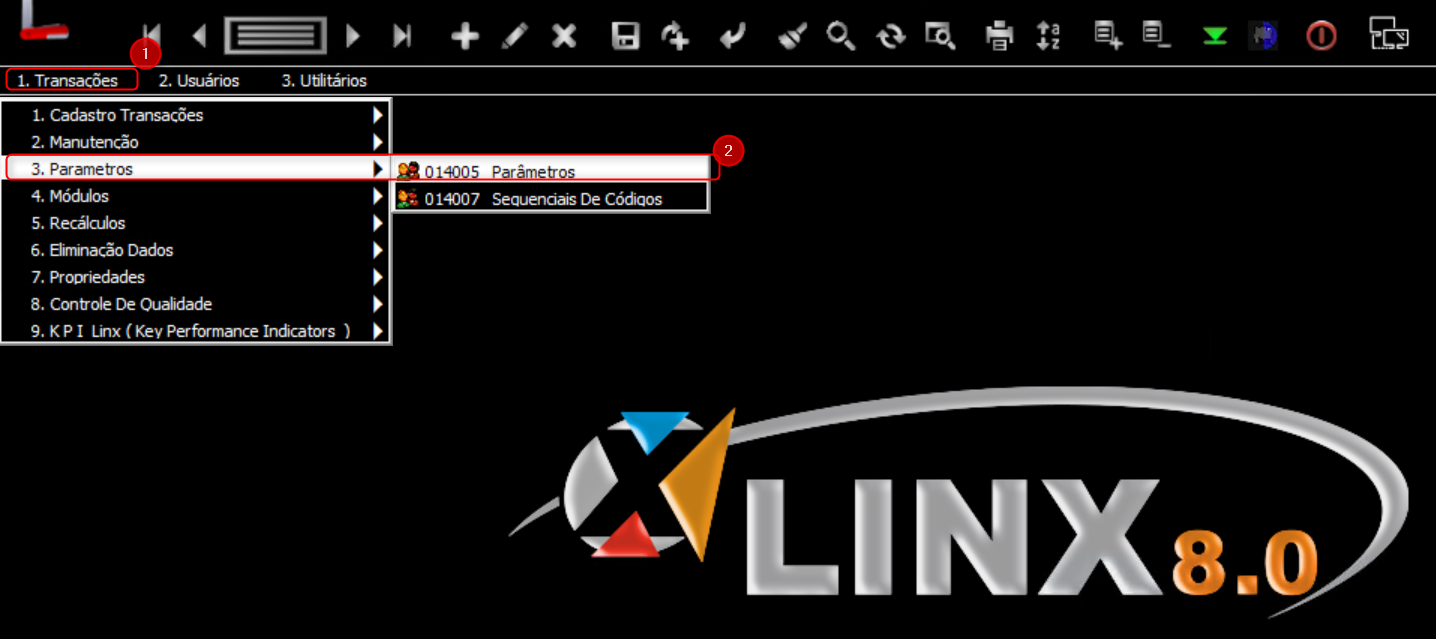 - Abra o Visual Linx e clique na seta verde e acesse Utilitários > Transações > Parâmetros > 014005 Parâmetros: