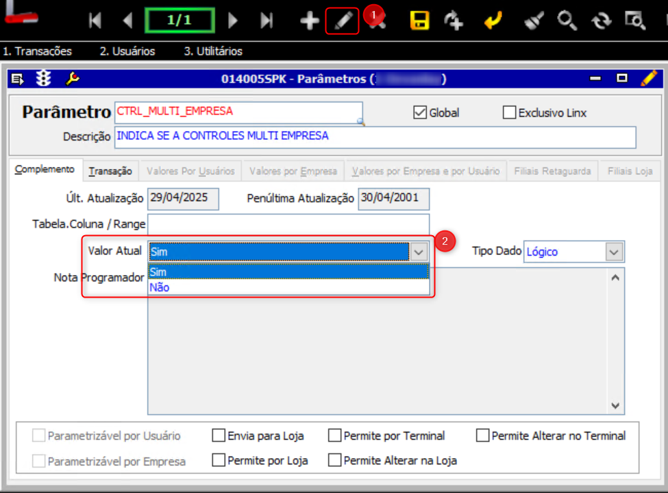 - Confirme se o Valor Atual está SIM, clique no botão Altera - F6 para alterar o campo e modifique o Valor Atual para NÃO:
