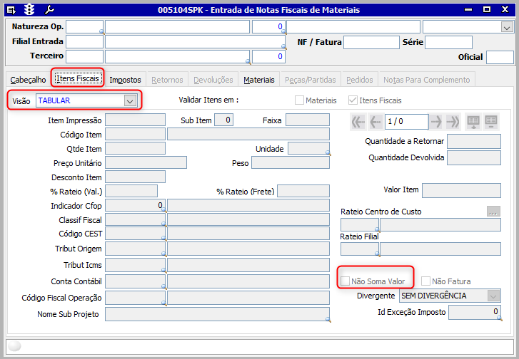 - Clique na Aba Itens Fiscais, selecione a visão Tabular e marque o checkbox Não Soma Valor, conforme imagem abaixo: