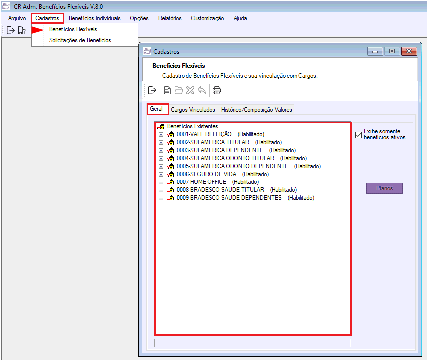 Passo 01: Acesse a aba "Cadastros", clique em "Benefícios Flexíveis" e no painel "Geral" clique no benefício correspondente ao desconto do Plano de Saúde do Colaborador.