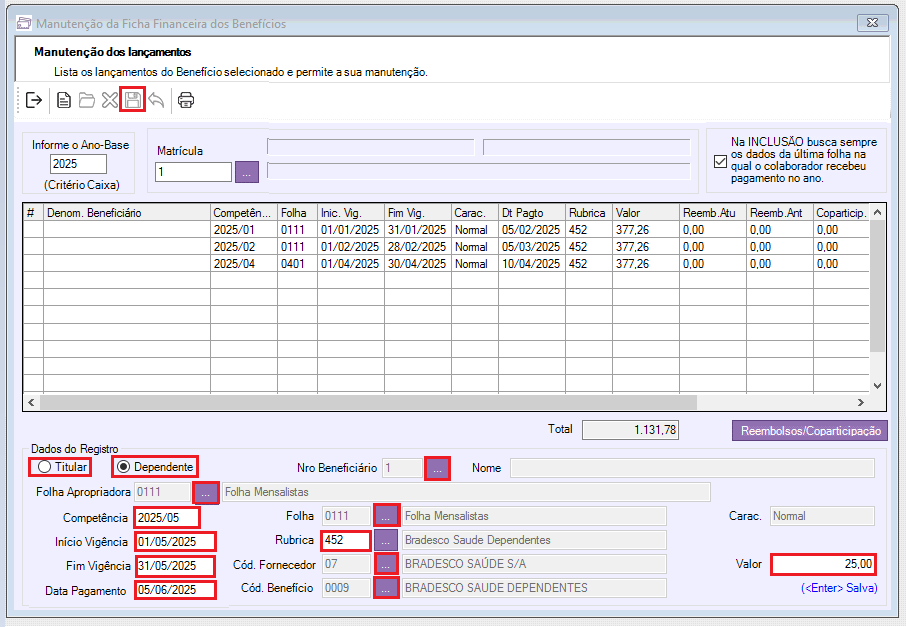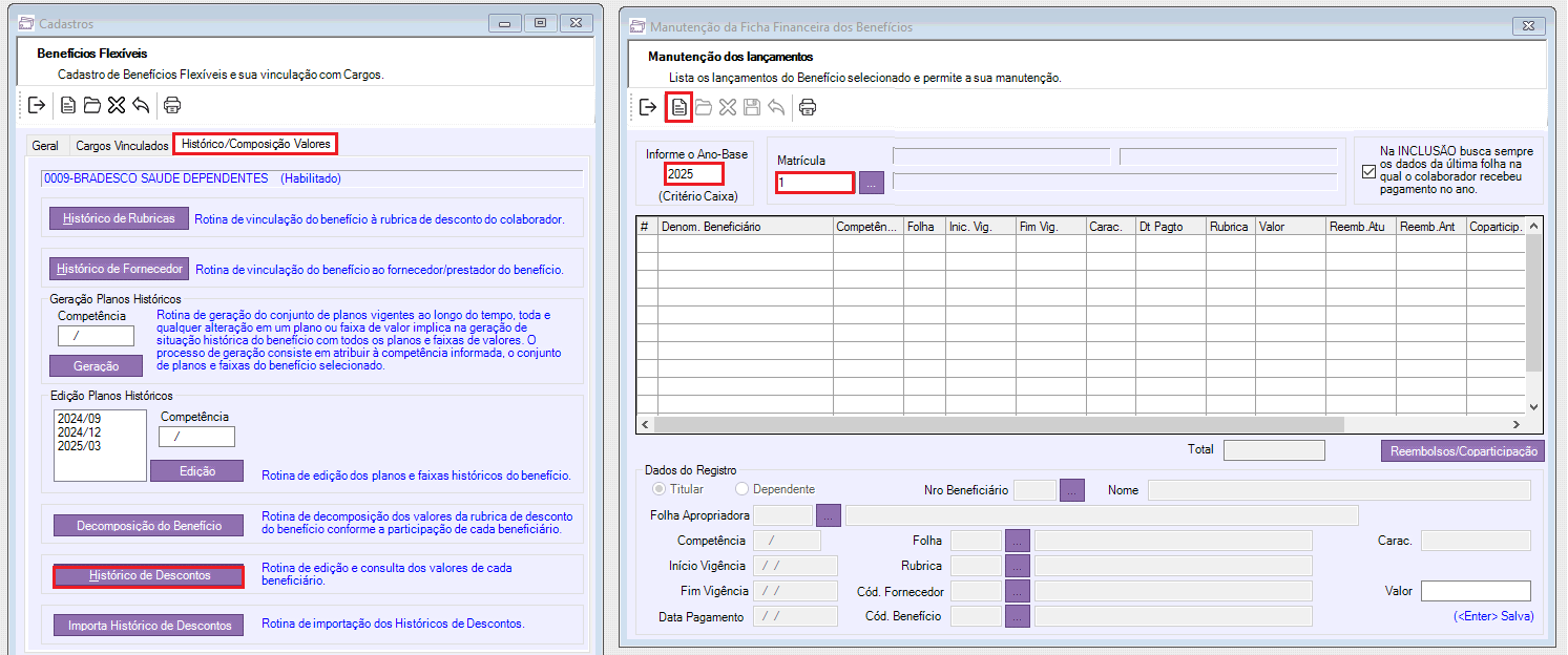 - Insira a "Competência" correspondente ao desconto da rubrica de Plano de Saúde;