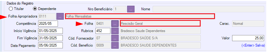 Obs.: Quando a decomposição do Benefício se referir a colaborador rescindido, deve-se selecionar a "Folha Apropriadora" como "0111 - Mensalistas" e a "Folha" como "0401 - Rescisão Geral".