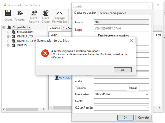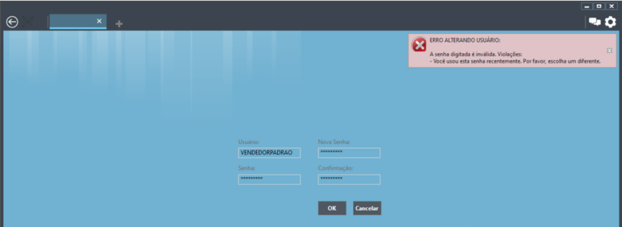 Na alteração de senha, será feita a validação comparando a senha expirada à nova senha informada pelo usuário e não será permitida a gravação da senha caso ambas sejam iguais: