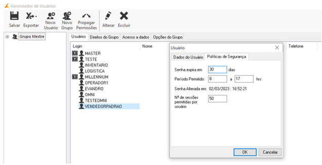 - Deverá ter configuração de prazos para expirar as senhas dos usuários, na guia Políticas de Segurança.