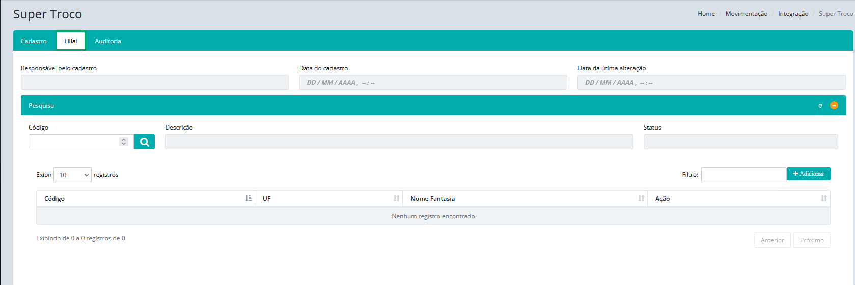 Nesta tela é possível observar as abas Cadastro, Filial e Auditoria, para acessar a tela, siga o caminho: