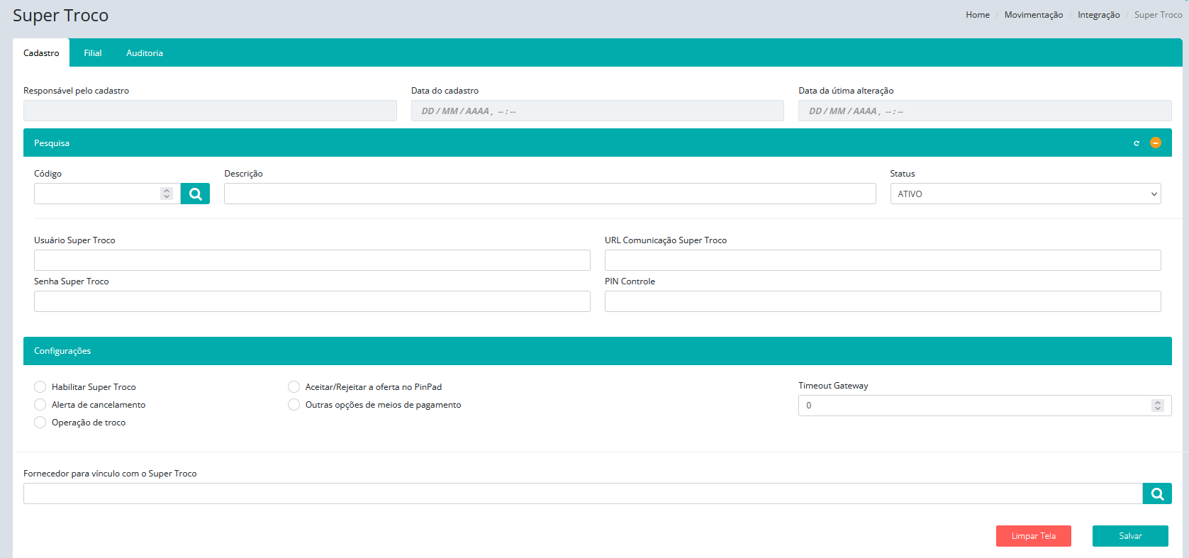 • Campo URL Comunicação Super Troco: Campo para informar a URL de comunicação Super Troco.