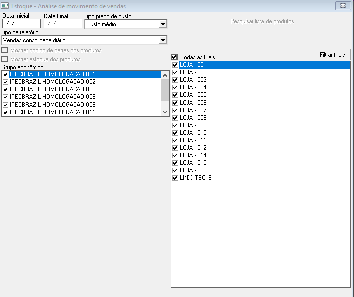 Nessa tela existe também o campo para seleção de Filiais, e botão para filtro de filiais.