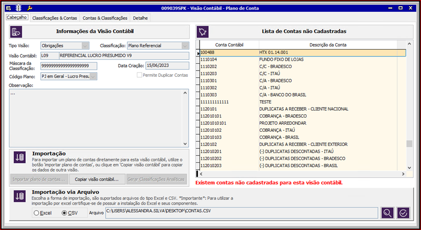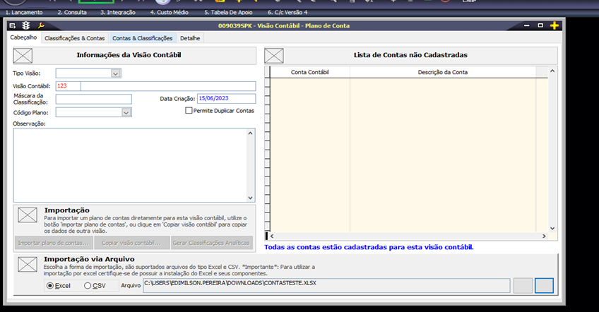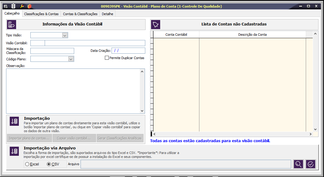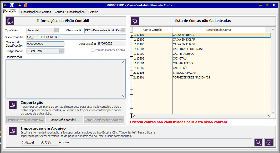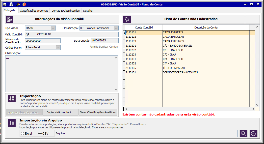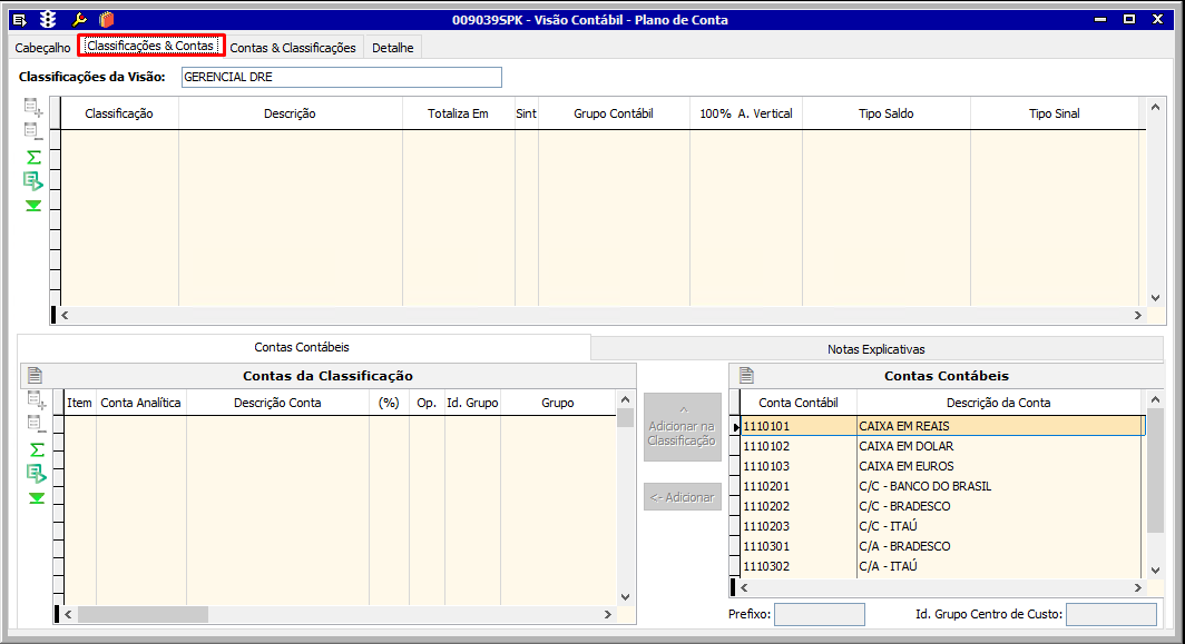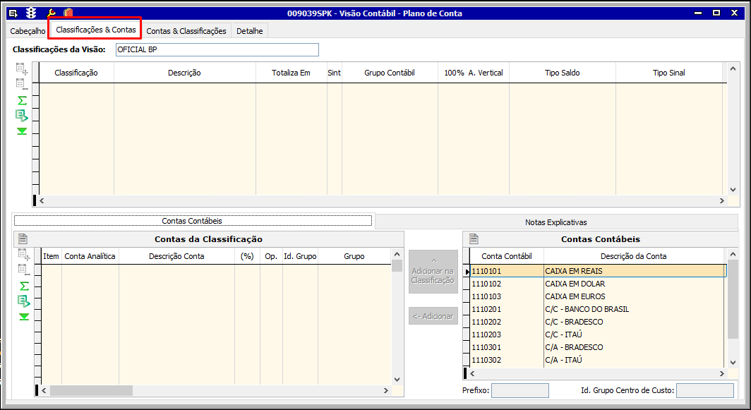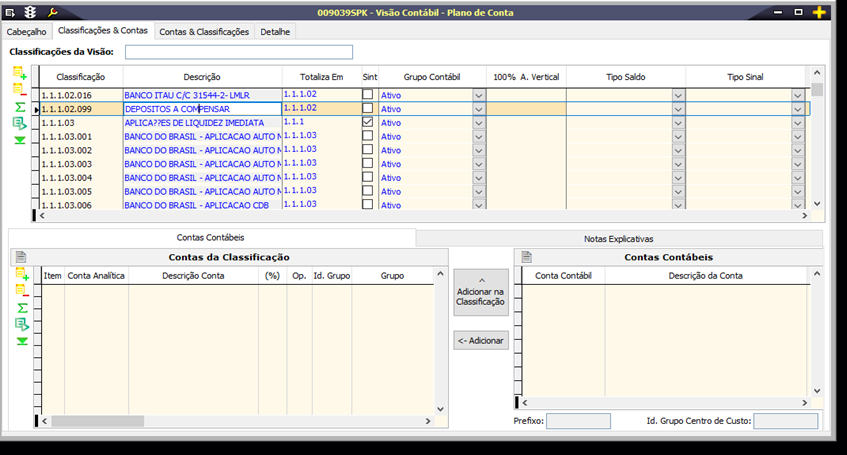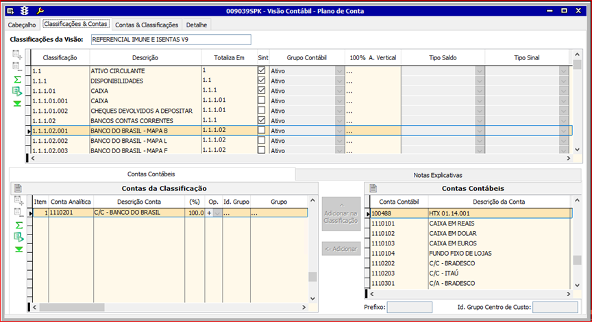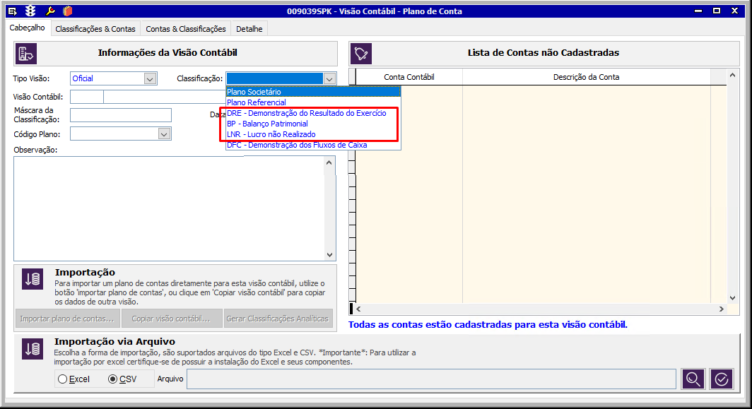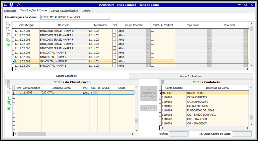 - Conta contábil vinculado a Lista de Contas e a aba Classificação & Contas