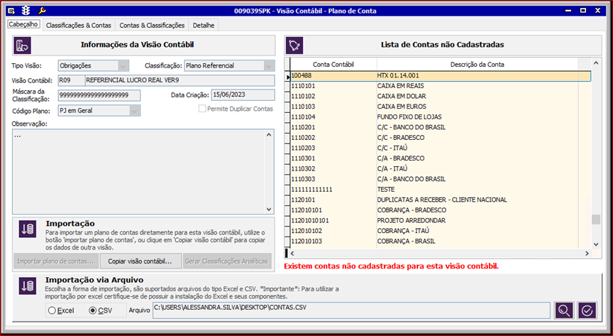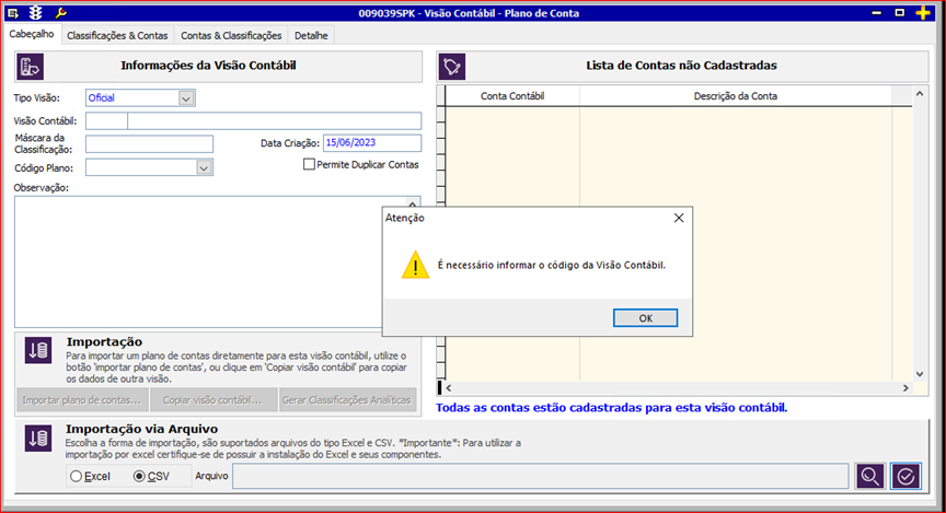 Caso o cliente tente criar um Plano de Contas sem informar o nome da visão e tente importar o arquivo, aparecerá na tela uma mensagem de alerta.