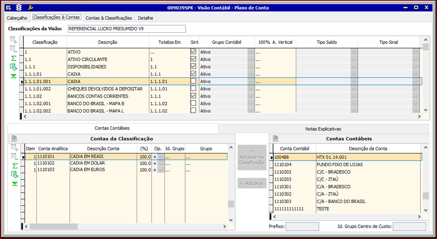 Plano de Conta criado para o modelo Lucro Presumido através da tela 009039.