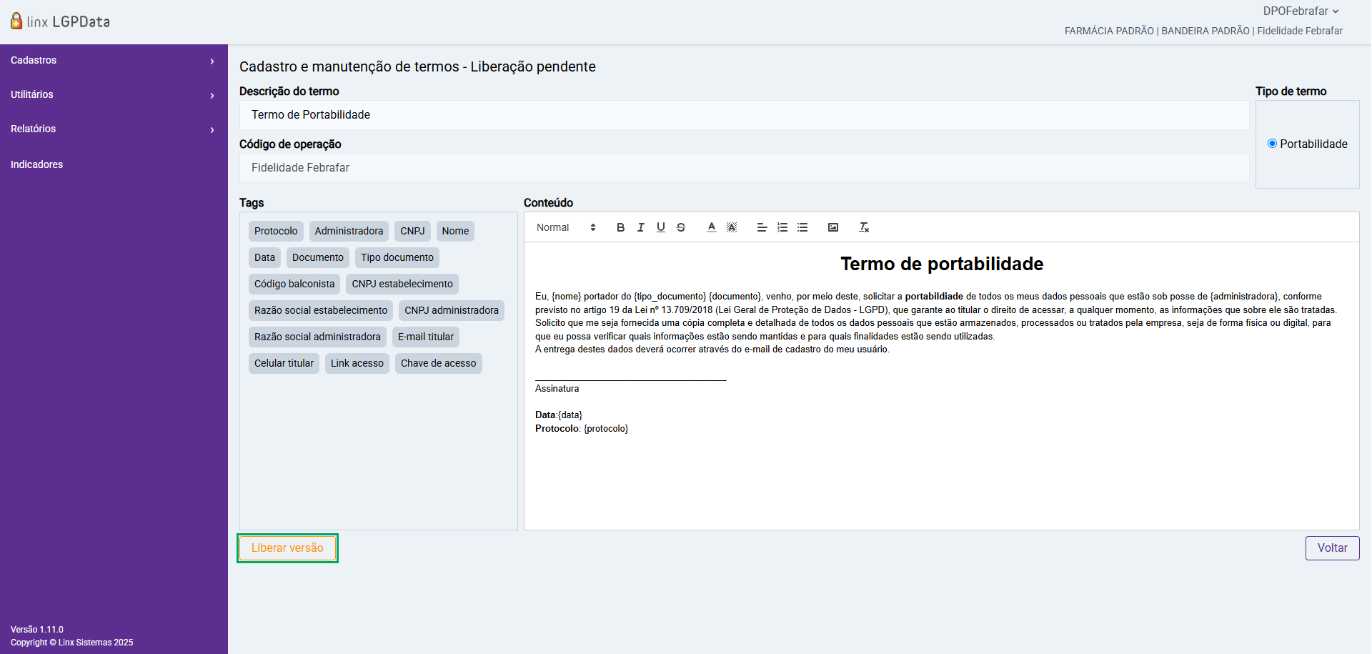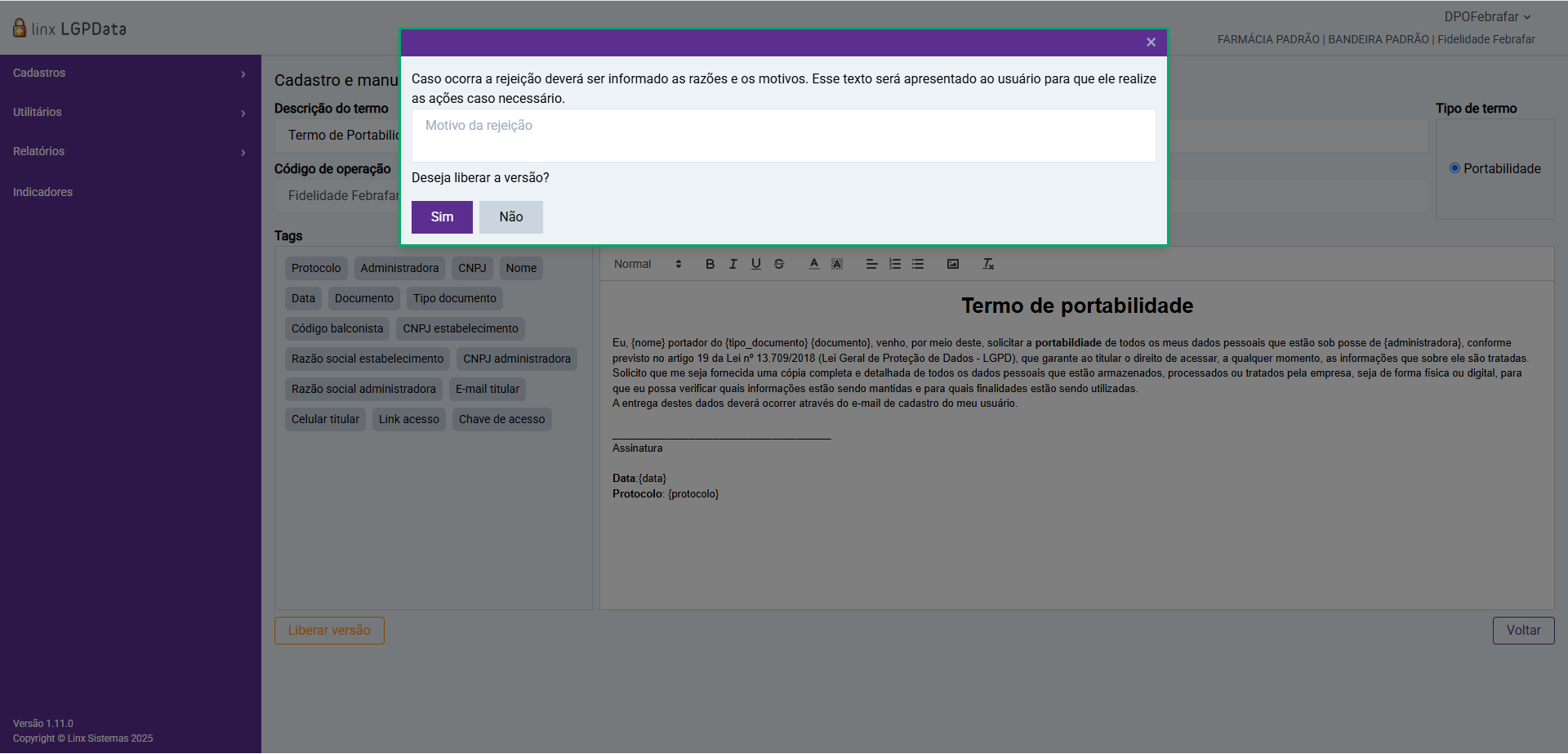 - Se o DPO revisar o termo e estiver tudo correto, no campo Deseja liberar a versão, selecione Sim. Será exibida a mensagem: "Versão liberada com sucesso.".