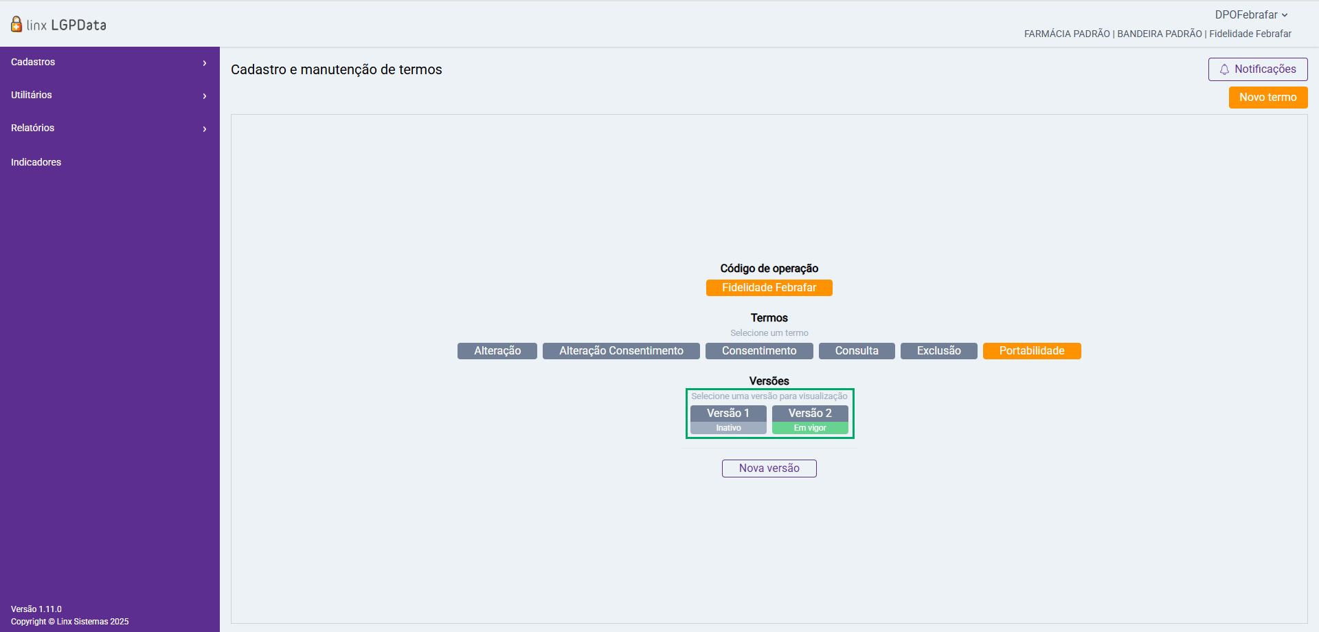 - Após a liberação da versão do termo, a versão anterior é automaticamente inativada, e a nova passa a ficar com status Em vigor.