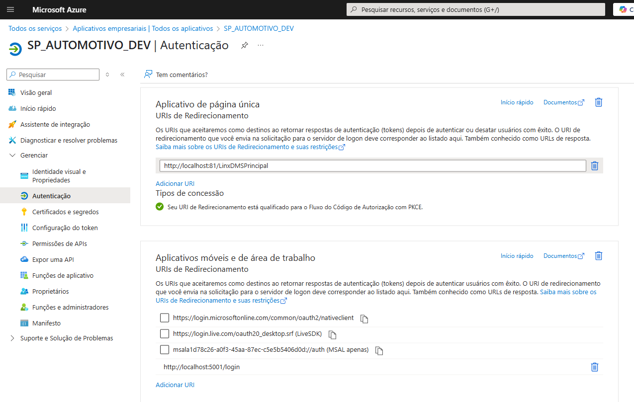 • Incluir URIs de Redirecionamento: Inclua as URIs de redirecionamento da aplicação após o login para cada plataforma:
