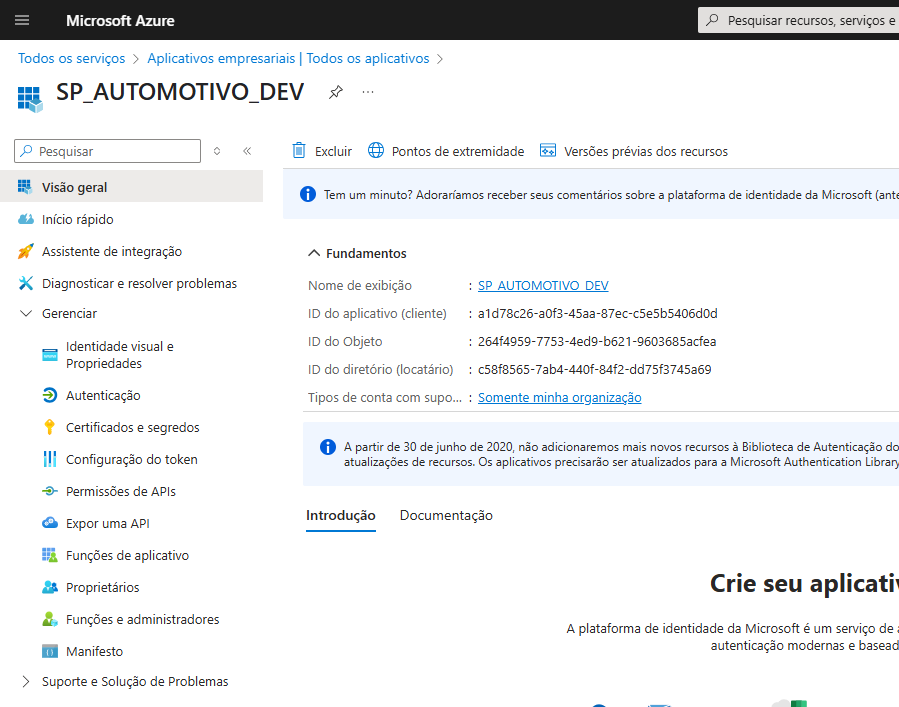 • Copiar IDs: Acesse a opção de "Visão Geral" do aplicativo criado e copie as opções "ID do aplicativo (Cliente)" e "ID do diretório (locatário)". Essas informações serão necessárias para a configuração no Linx DMS.