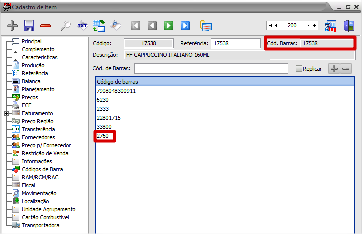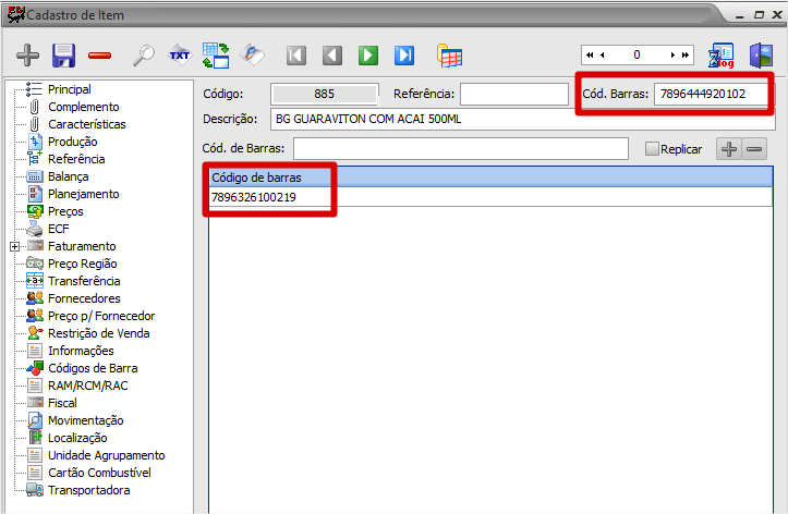 O item recebe o código de barras do item anterior e passa a ser um adicional do item principal, e o anterior fica sem código de barras: