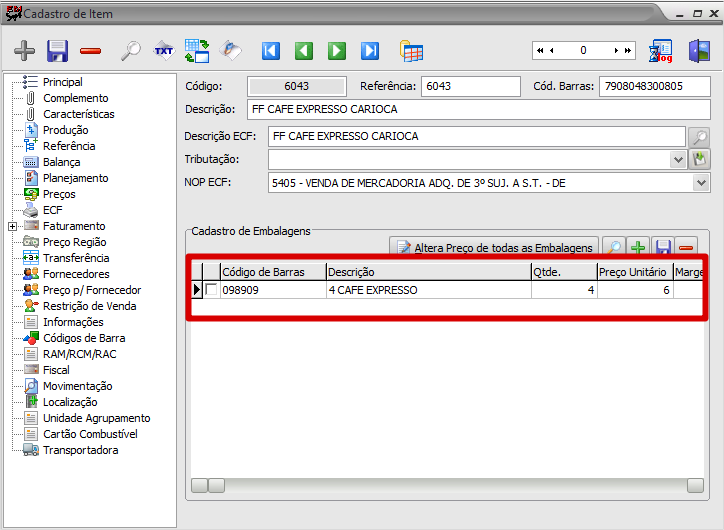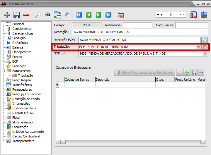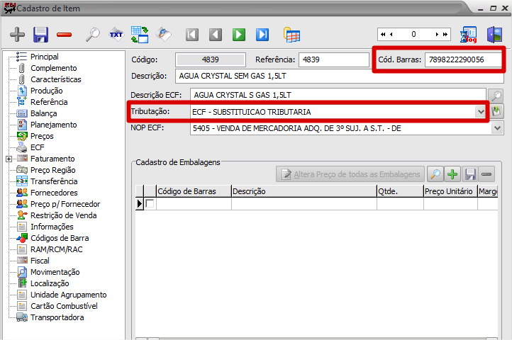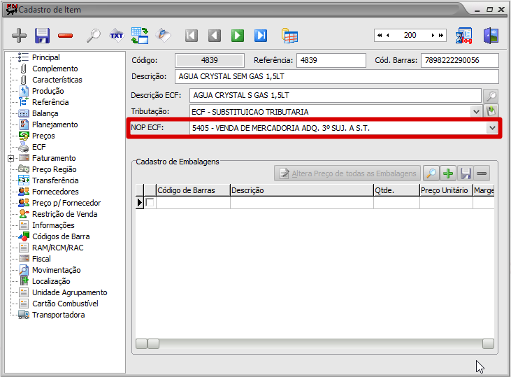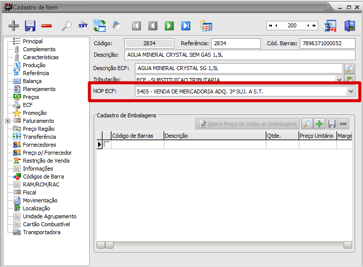 As promoções que são do grupo Embalagens, (Ex: Pack de Cerveja) não serão inseridos nas promoções mix, e sim no cadastro do item na aba ECF, como mostra na imagem.